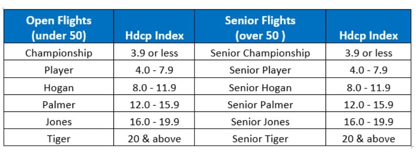 U.S. AM Tour offers six separate flights for both Open and Senior players. Senior flights are guaranteed at the Senior National Championship but may not be available at local or Major tournaments, depending on participation and interest.