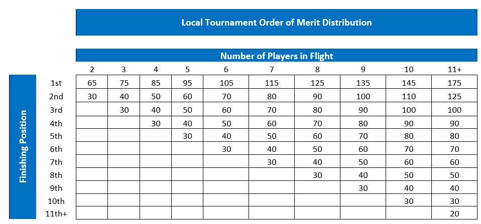 - Order of Merit / Local Player of the Year Points will be deducted starting on February 1st, if necessary, into a tie for 3rd place as player recognizes that the points accrued were in a less competitive flight